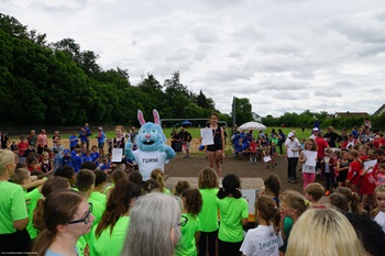 Bei der Siegerehrung war auch in diesem Jahr wieder Turni zu Gast und winkte mit seiner blauen Hasenpfote den Kindern und Jugendlichen zu. Auf vielen Gruppenbildern wird der blaue Turnhase,das Maskottchen des Schwäbischen Turnerbundes,zu finden sein.