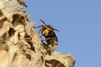 Bei den Hornissen (Vespa crabro) wachsen jetzt im Hochsommer die ersten Männchen und Jungköniginnen heran. Im Spätsommer verlassen sie zur Paarung das Nest. Nur die begatteten Königinnen,die bis zu 35 Millimeter groß werden können,überwintern. Die kalte Jahreszeit überstehen sie dank eines körpereigenen Frostschutzes,während alle anderen Tiere beim ersten Frost sterben. Im späten Frühjahr fliegen die Königinnen dann wieder aus,um nach Nahrung zu suchen und ein neues Nest zu gründen. Als Nistplätze nutzen sie natürlicherweise Baumhöhlen. Wenn diese nicht zu finden sind,weichen sie gerne auf alte Schuppen,Nischen in Dachböden oder auch Holzverschalungen an Balkonen aus. Die ersten Waben und Schutzhüllen baut die Königin noch selbst,in dem sie Holzfasern zu einer papierartigen Masse zerkaut. Dann legt ihre Majestät die im Vorjahr befruchteten Eier ab,aus denen die Arbeiterinnen schlüpfen,die ihr den weiteren Nestbau abnehmen.