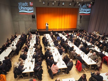 Es waren beängstige Szenen mitten Uhingen,die sonst nur in den Nachrichten zu sehen sind,wenn von heftigen Unwetterereignissen in anderen Teilen der Welt oder Deutschlands berichtet wird. Doch im Juni befanden sich einerseits viele Gemeinden entlang der Fils im Landkreis Göppingen im Ausnahmezustand – und Uhingen aufgrund der extremen Hochwasser- und Starkregen-Ereignisse im Speziellen. 500 Rettungskräfte aus dem gesamten Landkreis und benachbarten Landkreisen rückten nach Uhingen aus,um die große Katastrophe mit Menschenopfern zu verhindern. Bauunternehmen stellten großes Gerät und nach dem Unwetterwochenende packten ehrenamtliche Helfer voller Tatendrang an. „Ich bin tief beeindruckt von dem,was Sie alle geleistet haben“,wandte sich Uhingens Bürgermeister nun kürzlich an die Helfer. Und davon waren es einige: Von den mehr als 500 Frauen und Männern,die die Stadt Uhingen zu einem zünftigen Helfer-Vesper ins Uditorium eingeladen hatte,waren mehr als 300 gekommen. „Ich bin aber auch beeindruckt davon,dass Sie heute hier so zahlreich vertreten sind“,zollte der Bürgermeister den Anwesenden Respekt.Und es war wirklich ein beeindruckendes Erlebnis,so viele Rettungskräfte unterschiedlicher Feuerwehren,verschiedener Ortsverbände des Technischen Hilfswerks,der Malteser sowie Bürgerinnen und Bürger zu sehen,die nicht in konzentrierter Anspannung in einer schier unüberschaubaren Situation den Überblick behielten. Nein,völlig entspannt genossen sie einen Abend,der zwar den Hochwasser und Starkregen-Ereignissen in Uhingen und den Stadtteilen geschuldet war,nun aber im Zeichen des Dankes und der Geselligkeit stand. „Wir sind für solche Großeinsätze des Dankes nicht gerüstet“,gestand Uhingens Stadtoberhaupt mit einem Augenzwinkern: „Wir werden Einweiser zum Parken benötigen,wenn wir das nächste Helfer-Vesper veranstalten – nur diesmal ohne Hochwasser oder andere Unwetterereignisse.“ Denn das letzte Mal,dass so viele Rettungskräfte und Einsatzfahrzeuge in Uhingen anzutreffen waren,war im Juni. Wer am Abend des Helfer-Vespers in Uhingen einkaufen war,hätte angesichts der schieren Anzahl an Feuerwehr-,THW- und Malteser-Fahrzeugen den Eindruck erhalten können,in Uhingen findet eine Rettungskräfte-Tagung des Landes statt.Doch nicht nur Rettungskräfte befanden sich unter den Anwesenden,sondern auch engagierte Bürgerinnen und Bürger,die in den Tagen nach dem Hochwasser bei betroffenen angepackt und beispielsweise vollgelaufene Keller ausgeräumt haben. Auch Gastronomen aus Uhingen waren eingeladen,da sie während des Unwetters die Einsatzkräfte mit Essen und Getränken versorgt hatten. „Sie kamen von den Einsätzen vor Ort und mussten sich keine Gedanken darüber machen,wo sie etwas zum Essen herbekommen: Es wurde geliefert und hat alle zusätzlich motiviert“,bemerkte Matthias Wittlinger. Und auch Mitarbeitende der Stadtverwaltung,die beim Unwetter-Wochenende außerhalb ihrer Arbeitszeiten im Krisenstab  und vor Ort beispielsweise im Stadtteil Holzhausen die Maßnahmen mit den Rettern abstimmten und in den darauffolgenden Tagen die Hilfsanfragen von Betroffenen sowie engagierten Menschen koordiniert haben. „Es ist mir ein sehr großes Anliegen,Danke zu sagen. Es war beeindruckend zu sehen,was man gemeinsam leisten kann“,wandte sich Uhingens Bürgermeister an die mehr als 300 Menschen im Uditorium. „Es waren so viele Menschen,so viele Trupps im Einsatz und alle haben sich auf ihren Aufgabenbereich konzentriert.“Und beim Helfer-Vesper,aufgetischt von den Mitgliedern des Fischereivereins,dürften die meisten Anwesenden erstmals – fast 6 Monate nach den heftigen Ereignissen – einen Gesamtüberblick über das gesamte Ausmaß von Hochwasser und Starkregen erhalten haben. Denn Uhingens Feuerwehrkommandant Steffen Kwiatkowski schilderte das dramatische Wochenende aus Sicht des Einsatzleiters,der zahlreiche Maßnahmen und Hilferufe koordinieren musste. „Am Ende des Wochenendes hatten wir in ganz Uhingen 335 Einsatzstellen und alleine unsere Uhinger Kameradinnen und Kameraden haben 4034 Einsatzstunden geleistet.“Die geographische Lage von Uhingen im mittleren Filstal bringe einen Nachteil mit sich,sagte der Kommandant: „Was im Oberen Filstal als Niederschlag herunterkommt,kommt bei uns an.“ Schon am Freitagmorgen veranlassten die Verantwortlichen im Rathaus die ersten Schutzmaßnahmen wie etwa den Aufbau eines Schutzwalls am Lessingweg. Als der Pegel der Fils am Freitagabend gegen 21.30 Uhr zirka 250 Zentimeter betragen habe,wurden deshalb erste Maßnahmen eingeleitet,die eigentlich erst bei einer Pegelhöhe ab 300 Zentimetern ergriffen werden. „Wir haben sie früher ergriffen,weil wir wussten,was auf uns zukommt“,sagte der Kommandant.Vollgelaufene Keller,eine über die Ufer tretende Fils,Sturzbäche,Schlammwellen,Blaulicht,ratternde Pumpen,Schlafmangel,durchnässte Kleidung,unbelehrbare Schaulustige,Evakuierungen,Erdrutsche – bis in die frühen Morgenstunden des Montags herrschte Ausnahmezustand in Uhingen. „Am Sonntag gab es mittags im gesamten Landkreis Göppingen keine Sandsäcke mehr“,verdeutlicht Steffen Kwiatkowski die dramatische Lage. „Wir haben massiv Überlandhilfe angefordert.“ Die eine Hälfte der Rettungskräfte des Landkreises Göppingen war in Uhingen,die andere in Ebersbach. „Wir waren Gott froh über die Kräfte aus anderen Gemeinden“,zeigte sich der Kommandant auch Monate später dankbar. Denn am Montagmoren wurden die Uhinger Einsatzkräfte für 6 Stunden zum Zwangsschlafen geschickt,nachdem sie 3 Tage am Stück durchgemacht hatten. „Nach so einem Dauereinsatz kann die Einsatzbereitschaft irgendwann einfach nicht mehr aufrechtgehalten werden“,erklärte er. Dann hätten auswärtige Feuerwehren in Uhingen die Hochwasser-Einsätze abgearbeitet und die den Fall eines Brandes nötige Grundsicherung übernommen.Zugleich räumte Steffen Kwiatkowski auch mit einem Gerücht auf,das seit dem Unwetter durch Uhi