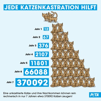 Rein rechnerisch können eine unkastrierte Katze und ihre Kinder innerhalb von sieben Jahren bis zu 370.000 Nachkommen zeugen. Die Landesregierungen sind laut § 13b Tierschutzgesetz ermächtigt,Gebiete mit sogenannten Kastrations-,Kennzeichnungs- und Registrierungsverordnungen festzulegen,um die hohe Zahl heimatloser Katzen zu verringern. Seit 2013 können sie aus Tierschutzgesichtspunkten Kastrationspflichten für Katzen erlassen. In über 1100 Städten und Gemeinden in Deutschland besteht diese bereits. Der „Flickenteppich“ lokaler Verordnungen ist jedoch nicht ausreichend – auch weil viele Kommunen sie aus unterschiedlichen Gründen nicht einführen wollen.