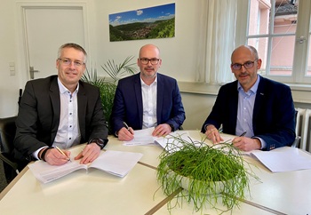 Foto (Stadtverwaltung Geislingen an der Steige): Thomas Dürr (SunFarmer GmbH),Oberbürgermeister Frank Dehmer und Peter Naab von den Stadtwerken bei der Vertragsunterzeichnung (von links nach rechts)
