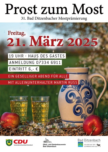 An der Mostprämierung können alle Mostherstellerinnen und Mosthersteller teilnehmen,die ihren eigenen Birnen- oder Apfelmost vorstellen möchten. Der Most sollte in zwei vollen Liter Flaschen ohne Etikett (grüne Flaschen) angeliefert werden. Die Annahme der Moste erfolgt am Freitag,21. März,von 16.00 bis 18.00 Uhr im Untergeschoss des Haus des Gastes,Helfensteinstraße 20,73342 Bad Ditzenbach.