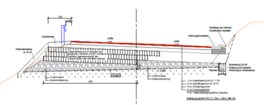 In den übrigen Bereichen sind in den talseitigen Fahrbahnrändern so genannte Geowaben eingebaut. Die Wabenstruktur übernimmt eine Bewehrungsfunktion im ungebundenen Oberbau und sichert den Fahrbahnrand gegen seitliche Setzungen.