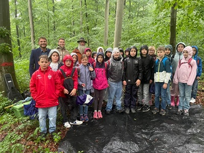 Foto: Vorsitzender der Schutzgemeinschaft Deutscher Wald (SDW) im Kreis und Bürgermeister Dennis Eberle besucht das waldpädagogische Angebot von Bernd Tochtermann gemeinsam mit dem Schulleiter der Staufeneckschule,Manuel Doll.