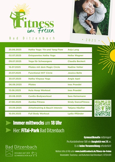 „Wir freuen uns sehr auf zahlreiche Teilnehmerinnen und Teilnehmer und auf einen aktiven Fitnesssommer in Bad Ditzenbach“,sagt Lena Horlacher,Leiterin des Tourismus- und Kulturbüros. „Besonders schön ist,dass wir mit dem Kursangebot den neuen FiTal-Park als Treffpunkt für Bewegung,Begegnung und Erholung nutzen können – er bietet die perfekte Kulisse für unser Sommerprogramm.“