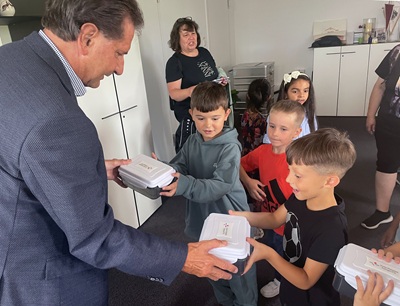 Foto (Bildquelle: Stadt Eislingen): Für Überraschung sorgte das Geschenk des Oberbürgermeisters: Passend für den Schulstart freuten sich die Kita-Kids über eine große Pausenbox für den Schulstart.