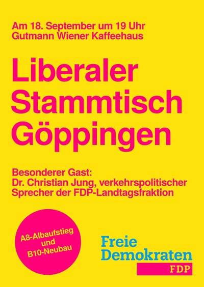 Der nächste „Liberale Stammtisch Göppingen“ findet direkt in der ersten Woche nach den Schulsommerferien am 18. September um 19:00 Uhr im Gutmann Wiener Kaffeehaus am Bahnhofsplatz in Göppingen statt.