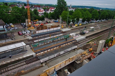 gearbeitet. Deshalb kam es am Wochenende auch zu Einschränkungen im Zugverkehr,denn nur die beiden südlichen Gleise waren in Betrieb. Rund um die Uhr und trotz teilweise widriger Wetterbedingungen konnten alle vorgesehenen Arbeiten nach Plan durchgeführt werden. Die Gleise mussten durchtrennt,gelöst und mitsamt der Hilfsbrücke nach oben gehoben und auf einen Tieflader aufgeladen werden. Anschließend wurden der Unterbau und das Schotterbett hergestellt,die Bahnschwellen und die Bahnschienen wieder eingesetzt,verschweißt und befestigt. Besonders aufwändig waren die Arbeiten im Bahnsteigbereich. Auch hier erfolgte zunächst der Rückbau der Bahnsteighilfsbrücke. Die Bohrpfähle,auf denen die Hilfsbrücke aufgelagert war,wurden gekürzt und die notwendigen Kabelverbindungen verlegt. Nachdem der Bahnsteig mit Betonpflaster wiederhergestellt war,konnte er am Montag wieder sicher betreten und genutzt werden. „In der nächsten Zeit werden die Zwischenräume unter den südlichen Gleisen verfüllt und die restlichen Betonblöcke an den Rampen erstellt. Mitte September steht wieder eine Gleissperrpause an. Dann werden die südlichen Bahnsteige hergestellt und die Gleise 1 und 2 verlegt. Danach ist die Baustelle im Bahnhofsbereich abgeschlossen“,gibt Martin Fischer einen Ausblick.