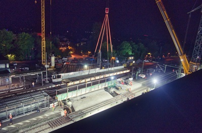 Nachdem die Blöcke der neuen Bahnunterführung unter den Bahngleisen hergestellt wurden,konnten zwei Stahlhilfsbrücken am vergangenen Wochenende entfernt und das Gleisbett und die Gleise 3 und 4 wieder eingebaut werden. Baufachleute waren Tag und Nacht im Einsatz. In nur 42 Stunden stellten sie die Hälfte des mittleren Bahnsteigs und zwei Bahngleise wieder her.