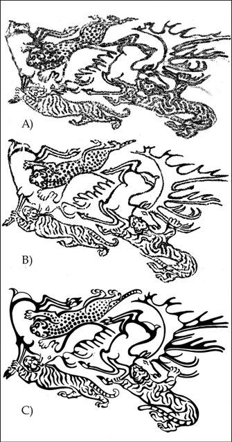 Die Bilder zeigen den Wissenschaftlern zufolge Pflanzenfresser,die von Tigern,Leoparden und einem Greif gejagt werden. Auf den Händen fanden sich Darstellungen von Vögeln.