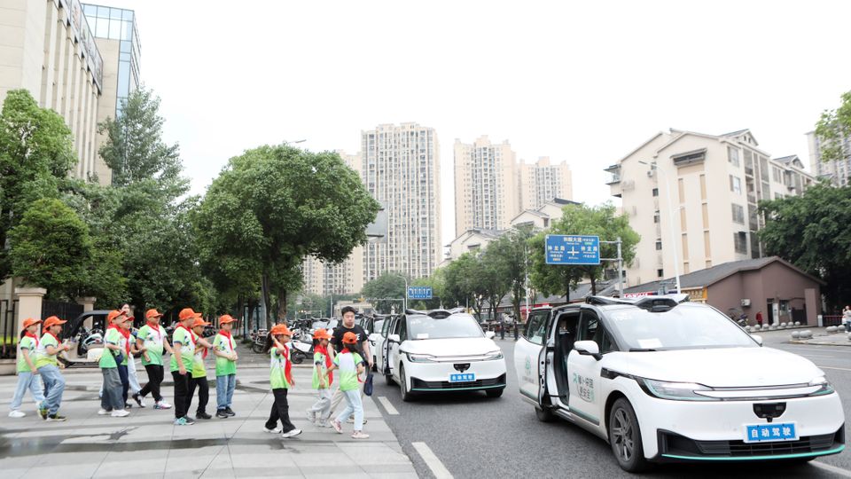 Schulkinder werden in der chinesischen Stadt Chongqing in die selbstfahrenden Taxis geleitet