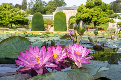 In der Wilhelma blühen die tropischen Seerosen. Im Hintergrund das Maurische Landhaus.