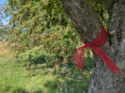 Foto (Bildquelle: Stadt Eislingen): Das rote Band an einem Obstbaum zeigt an,dass das Obst geerntet werden darf.