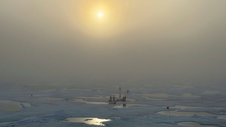 Arbeiten auf dem Meereis: Die Forschenden stapften durch Schmelztümpel und Eismatsch