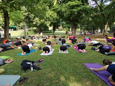 Ein Höhepunkt war eine Yogastunde mit rund 70 Teilnehmenden,die gemeinsam entspannten.