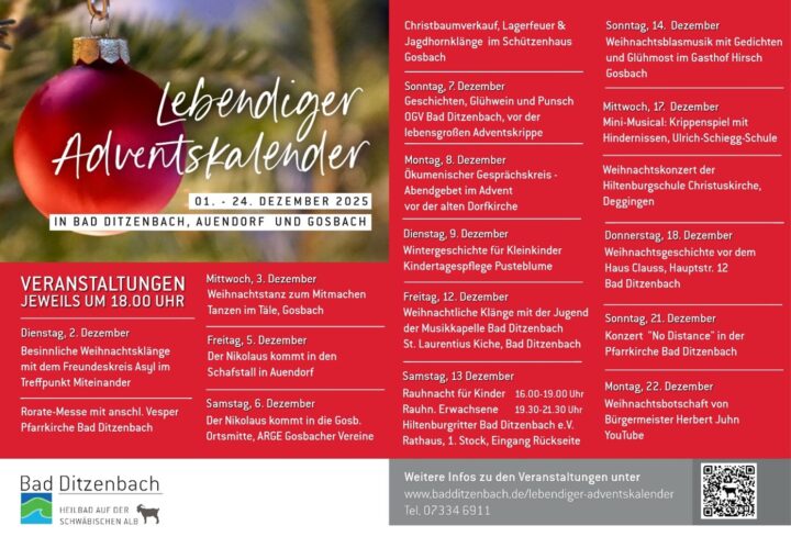 Beim „Lebendigen Adventskalender“ steht die gemeinsame Vorfreude auf Weihnachten im Mittelpunkt. Hinter jedem symbolischen Türchen verbirgt sich ein stimmungsvolles Adventserlebnis. An wechselnden Treffpunkten in Bad Ditzenbach,Auendorf und Gosbach erwartet die Besucher jeweils um 18 Uhr eine kleine Aktion oder Begegnung,die dazu einlädt,die Adventszeit miteinander zu genießen.