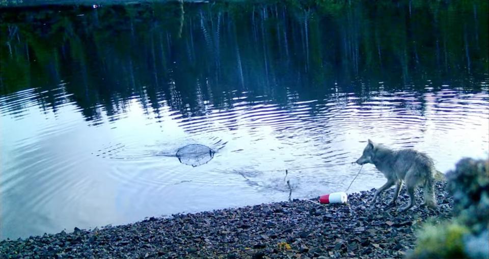 Ein Video zeigt die Wölfin,wie sie die Falle an Land zieht