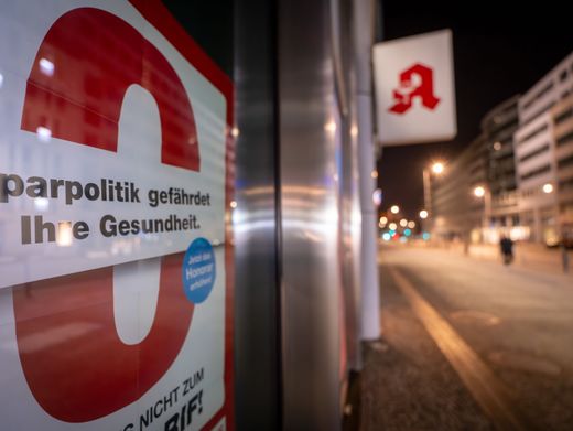 Protestbanner in einer Apotheke in Berlin: Notdienst bleibt gewährleistet