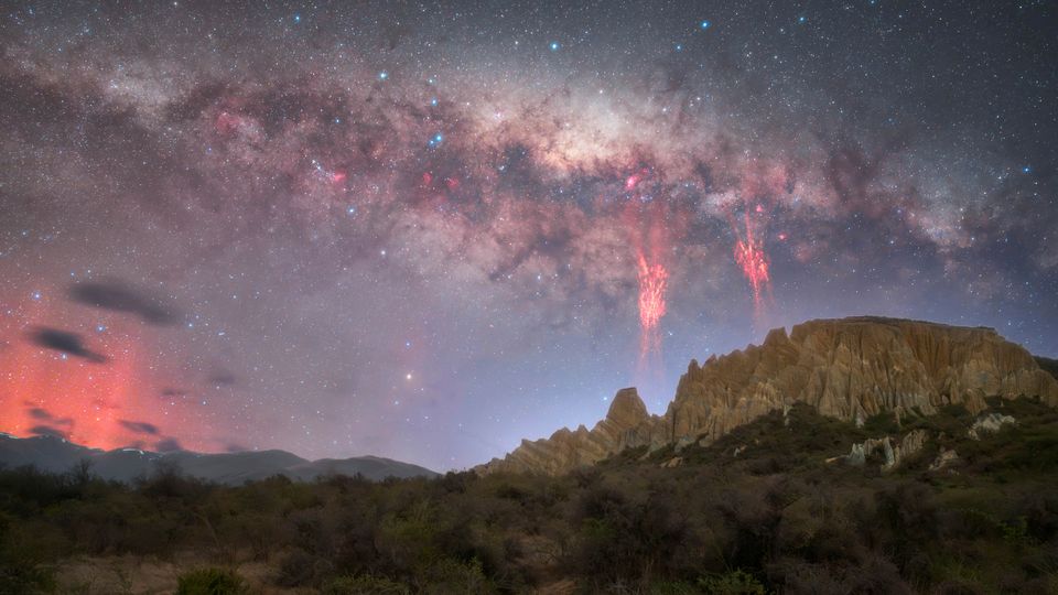 Drei Fotografen haben auf Neuseelands Südinsel eines der seltensten Lichtphänomene eingefangen – samt Polarlicht und Milchstraße. Die »Roten Kobolde« geben Forschenden bis heute Rätsel auf.