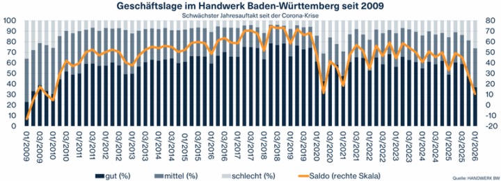Die wirtschaftliche Lage im baden-württembergischen Handwerk hat sich zum Jahresbeginn 2026 deutlich eingetrübt. So schlecht wurde die Geschäftslage zuletzt während der Corona-Pandemie bewertet – entsprechend hoch sind die Erwartungen des Handwerks an die aktuelle Wirtschaftspolitik. „Unsere neueste Umfrage ist ein ernstzunehmendes Warnsignal. Viele Betriebe stehen unter massivem Druck – vor allem durch die stark gestiegenen ...